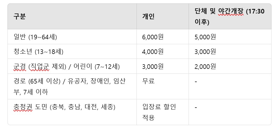 청남대 입장료는 아래의 표에서 확인할 수 있으며, 주차 요금은 무료입니다.